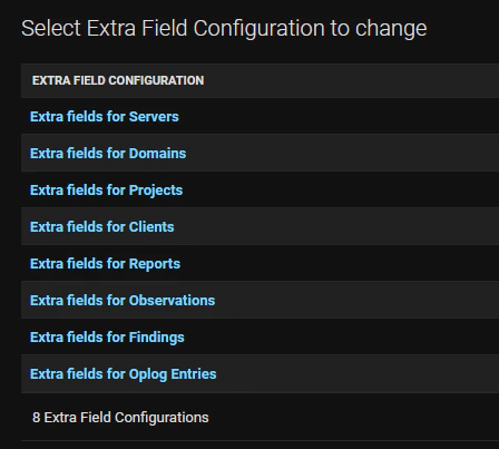 To configure extra fields, go to Admin Panel > Admin Panel, and then “Extra Field Configurations”. Then select the object type you wish to configure extra fields for.