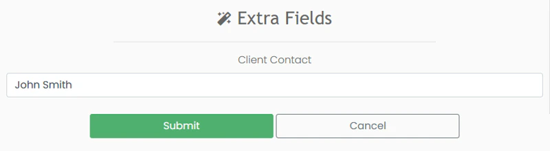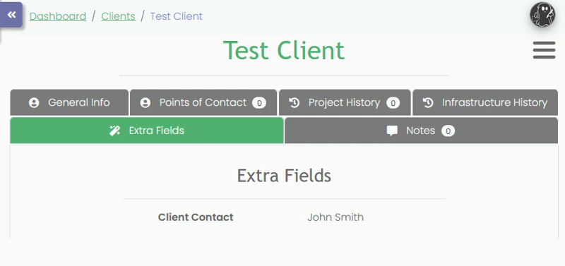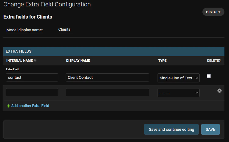 In templates, an object’s extra fields are stored as subattributes of theextra_fields attribute. For example, to display the field with the internal name internal_contact on a Client stored on the variable client, you can write {{client.extra_fields.internal_contact}}.