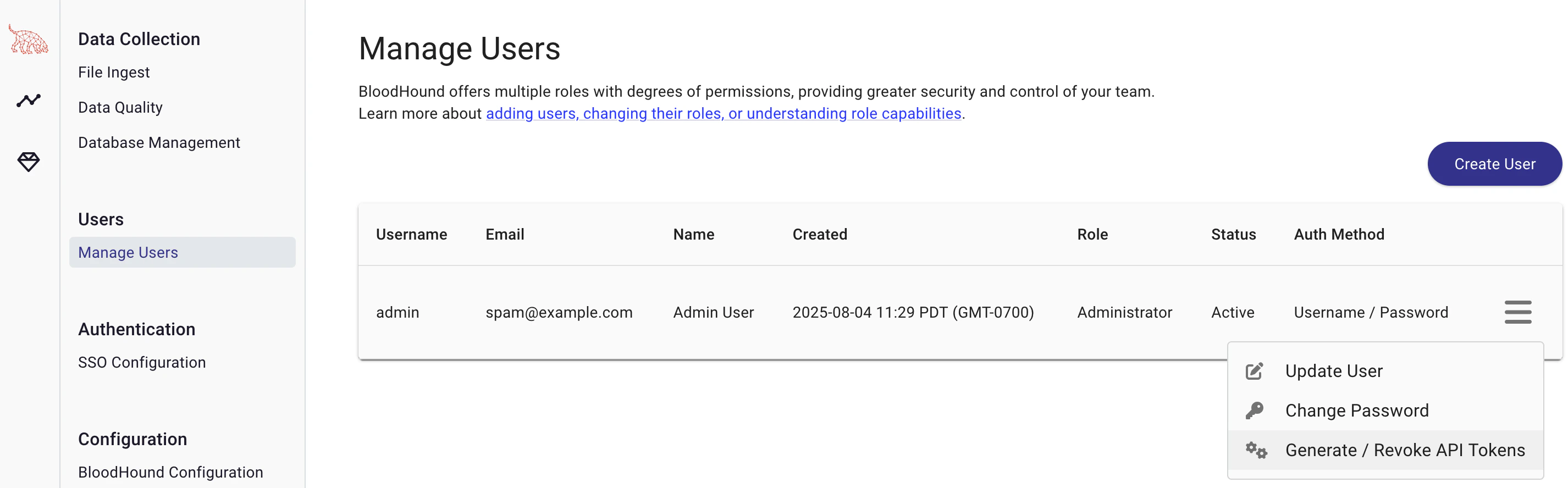 Generate your BloodHound access token by logging into your BloodHound instance and opening the Administration section from the sidebar menu. Click Manage Users and then click the hamburger menu next to the user you want to use for the API access. Select Generate/Revoke API Tokens.