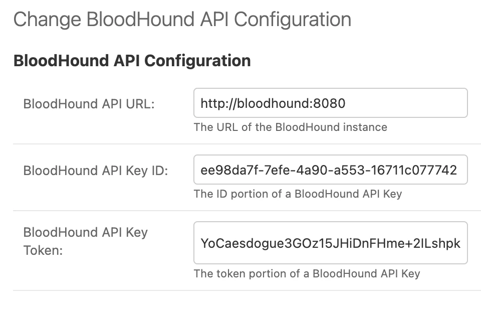Take the ID and Token values and plug them into the BloodHound API Configuration in Ghostwriter. You will also need to add the URL of your BloodHound instance. The URL should be the base URL of your BloodHound instance, including the protocol and port (if needed). For example,http://bloodhound:8080.