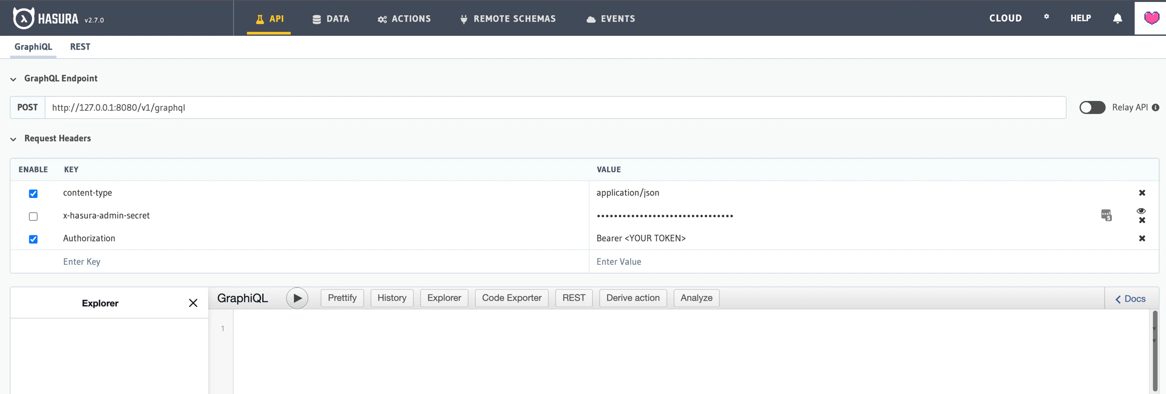 Once you have a token, uncheck the box next to the -X-Hasura-Admin-Secret header and create a new Authorization header. Your new API Explorer window will look something like this: