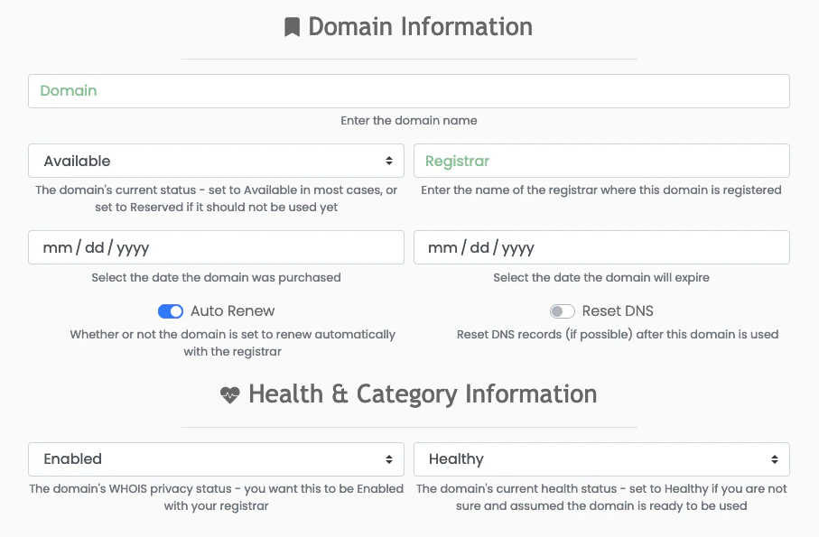 To add just one domain name to the library, click the Domains tab on the menu bar and Add New Domain. This opens the domain form for documenting and submitting a single domain name.You may not know the latest health information for the domain. You can set the domain to Healthy as a default value and leave categories blank.