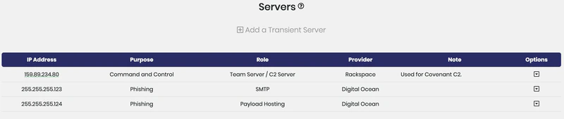 The infrastructure manager tracks static servers and transient servers. The server library tracks servers in theStaticServer model. These static servers are intended to be servers you own, such as your command control team servers.