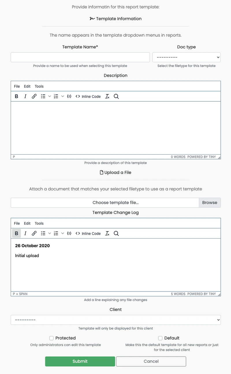 The Template Name is what users will select from the report template dropdown menus. The Doc Type (docx or pptx) affects under which reports the template will appear as an option and how the template linter reads the document. These two fields are required. The only other required field is the template document. These other fields are all optional:
